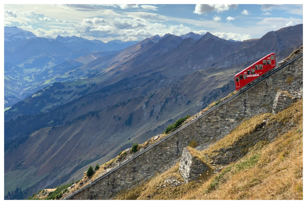 Take the Bernese Oberland Railway (BOB) to Lauterbrunnen. This 20 minute ride takes you up into the mountains. Switch to the Wengernalpbahn (WAB) cogwheel train for the final, amazing 15 minute journey to Wengen. The view of the valley behind you is unforgettable.